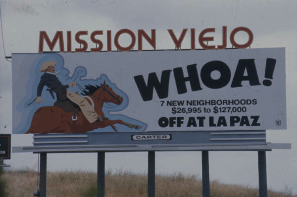 Off the I-5, an old freeway billboard advertising a new southern California town, Mission Viejo.